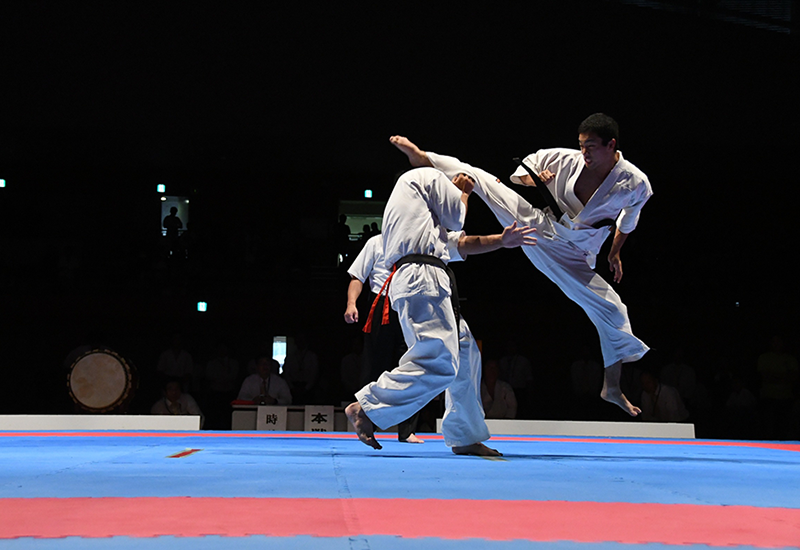 日本武道館にて、得意技だった飛び後ろ回し蹴り。30年後に息子がこの技で日本一になりました。